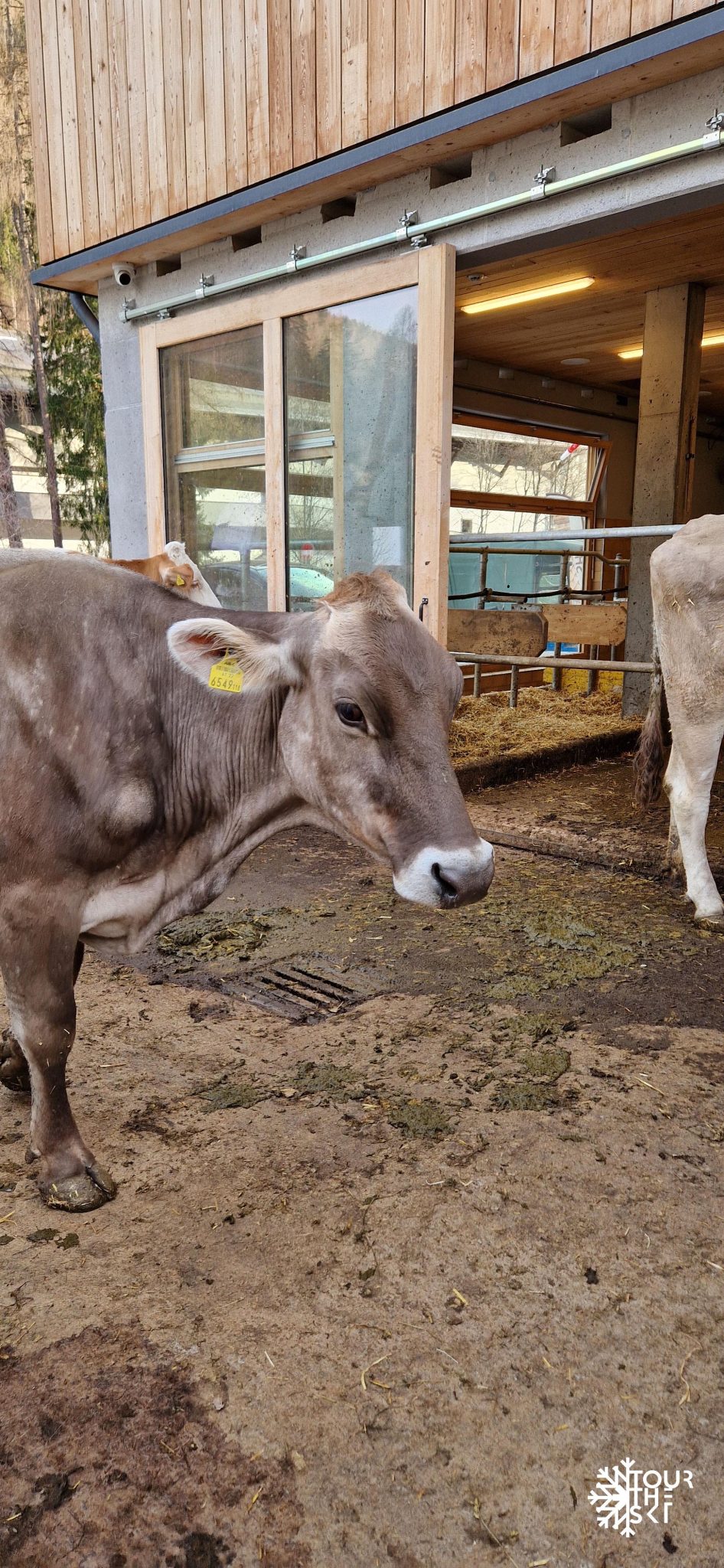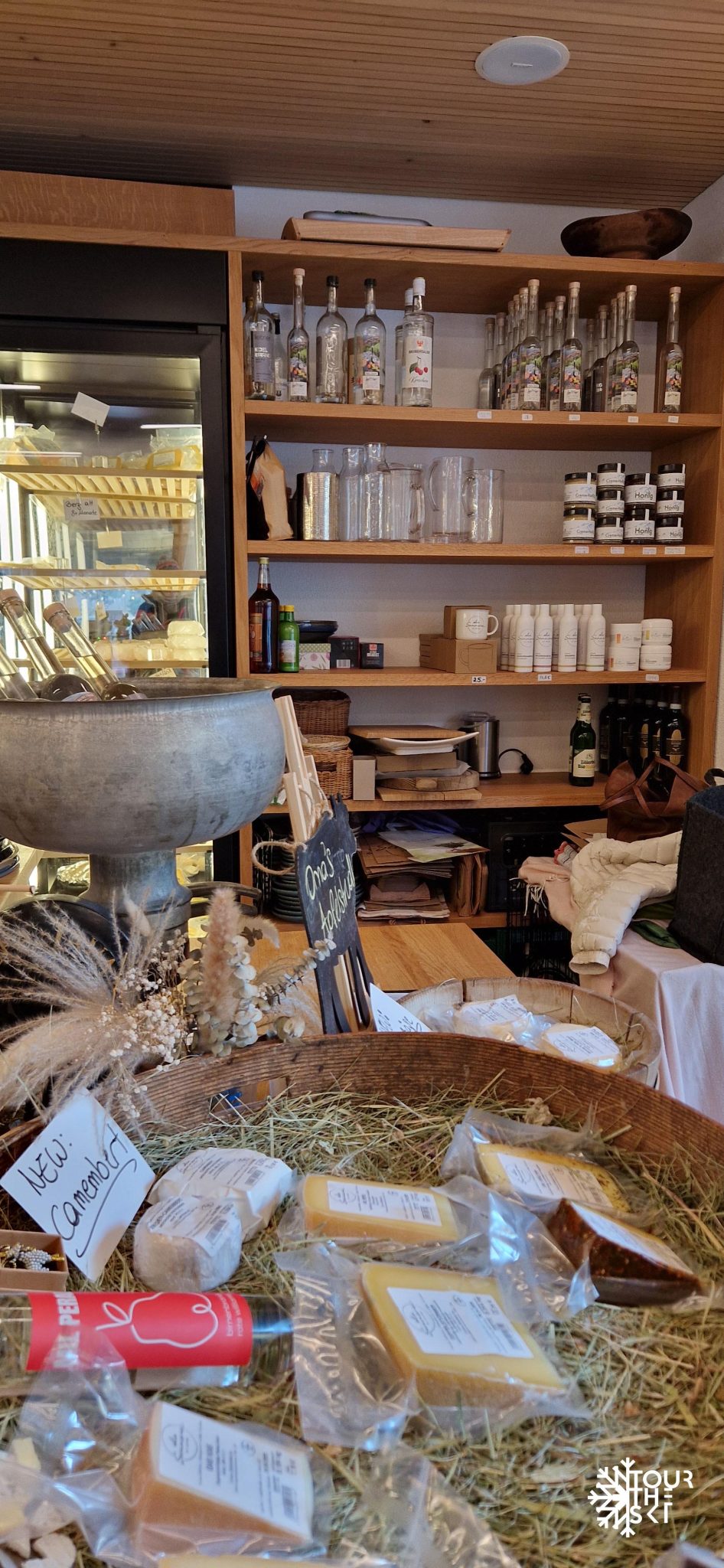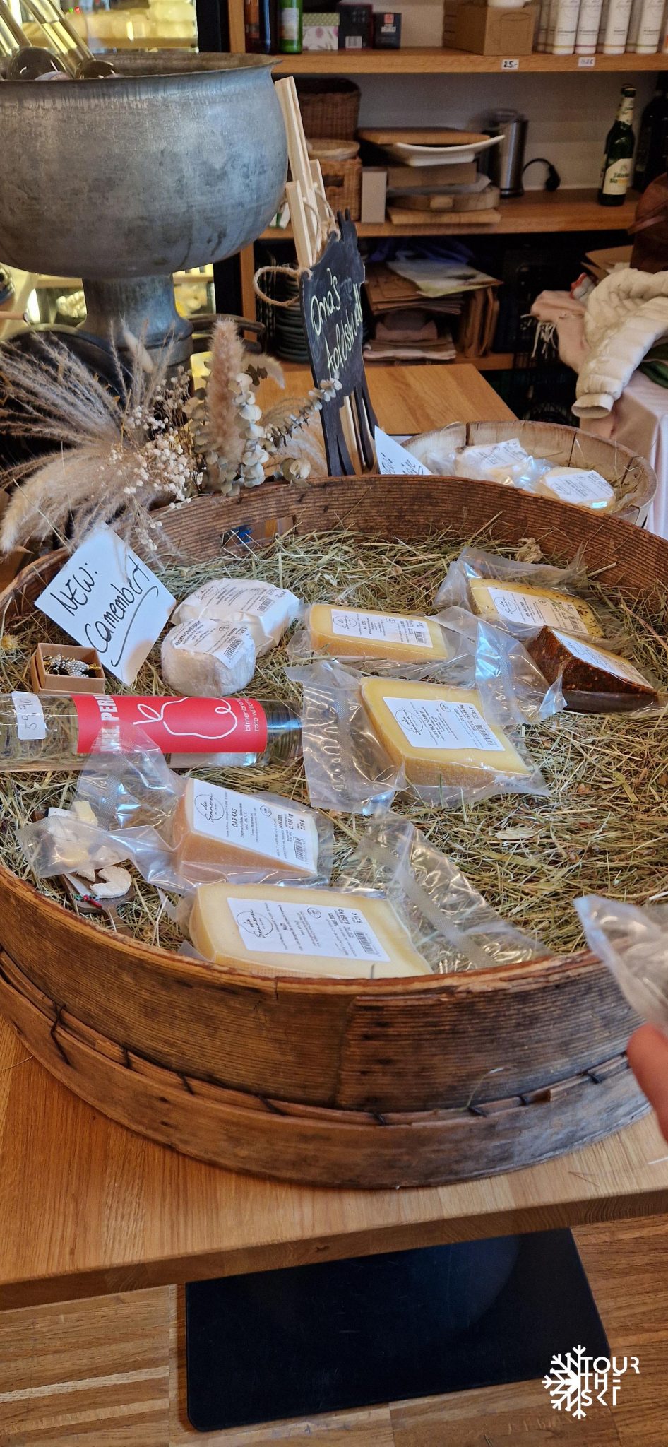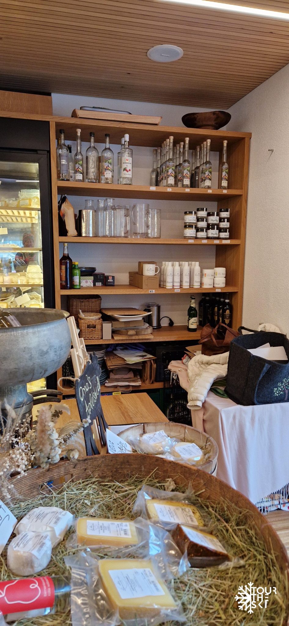 W samym miasteczku jest sporo knajpek, trochę sklepów, jest też obora w centrum, przy której jest kawiarnia z przezroczystą podłogą, dzięki czemu można podglądać dojrzewające poniżej sery :) W kawiarence można kupić oczywiście lokalne wyroby mleczne, ale i miejscowe wina oraz inne bajery :) W samej oborze królują krowy rasy szara alpejska oraz przeurocze kozy :)