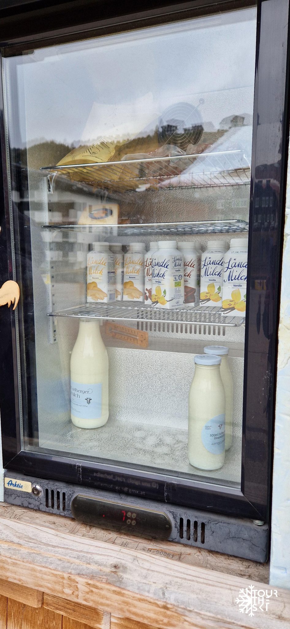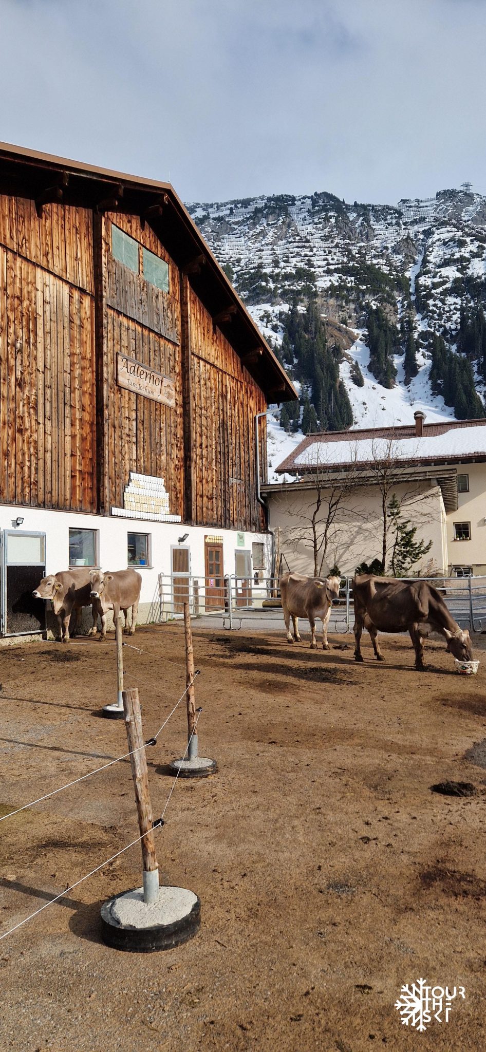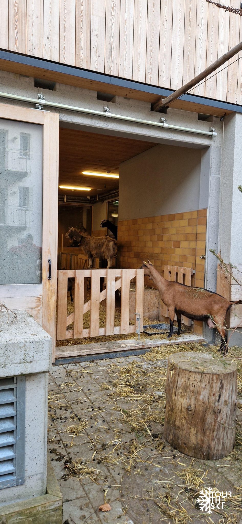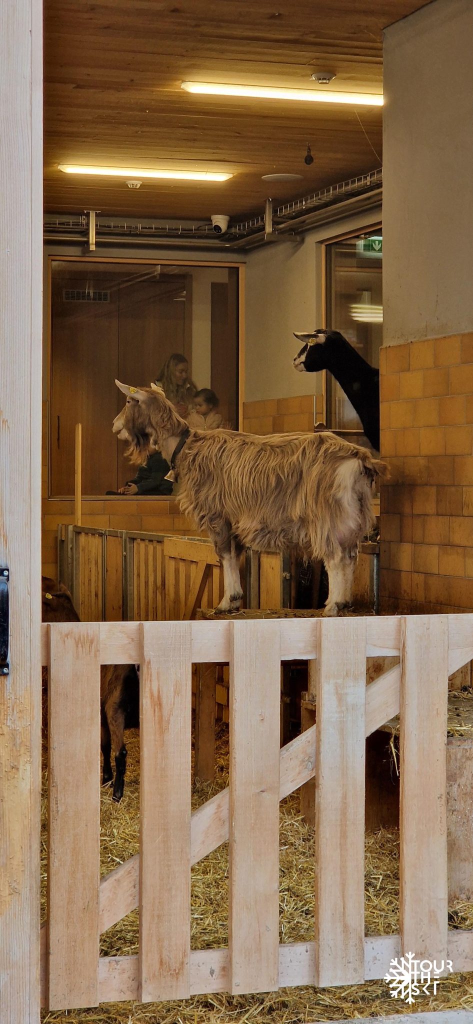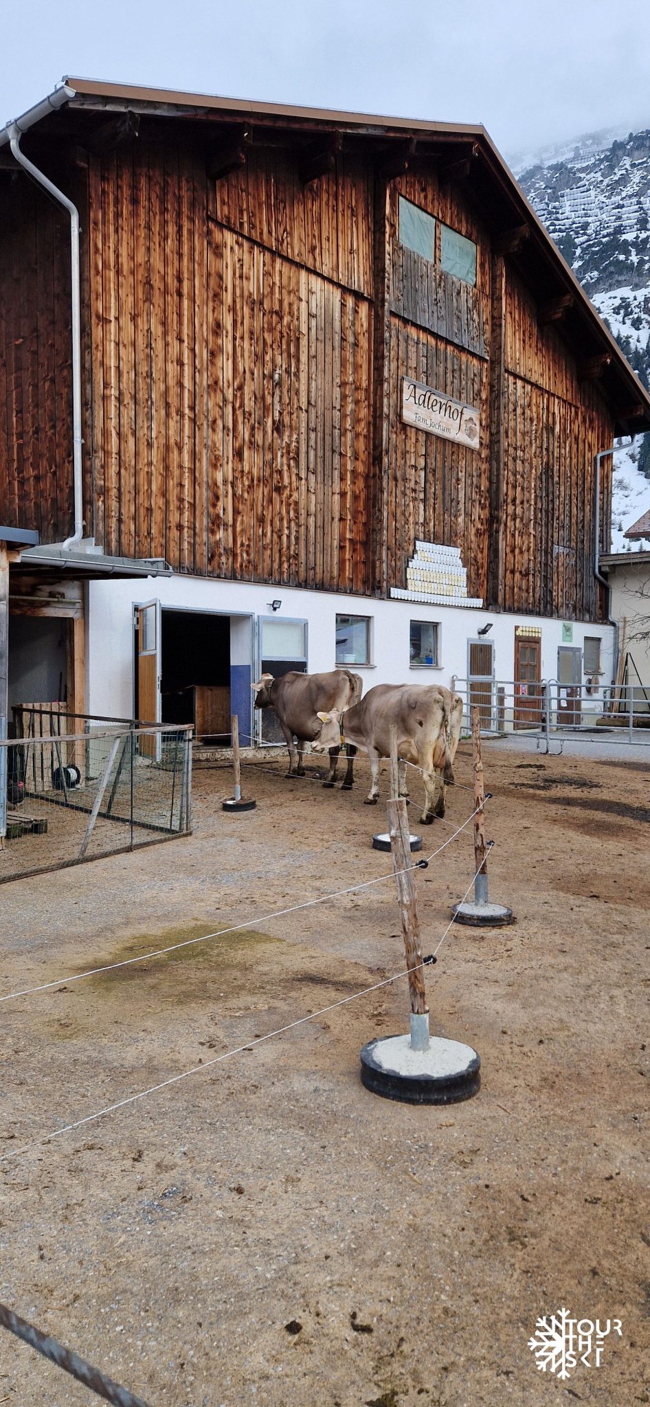 W samym miasteczku jest sporo knajpek, trochę sklepów, jest też obora w centrum, przy której jest kawiarnia z przezroczystą podłogą, dzięki czemu można podglądać dojrzewające poniżej sery :) W kawiarence można kupić oczywiście lokalne wyroby mleczne, ale i miejscowe wina oraz inne bajery :) W samej oborze królują krowy rasy szara alpejska oraz przeurocze kozy :)